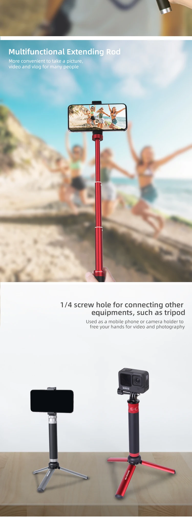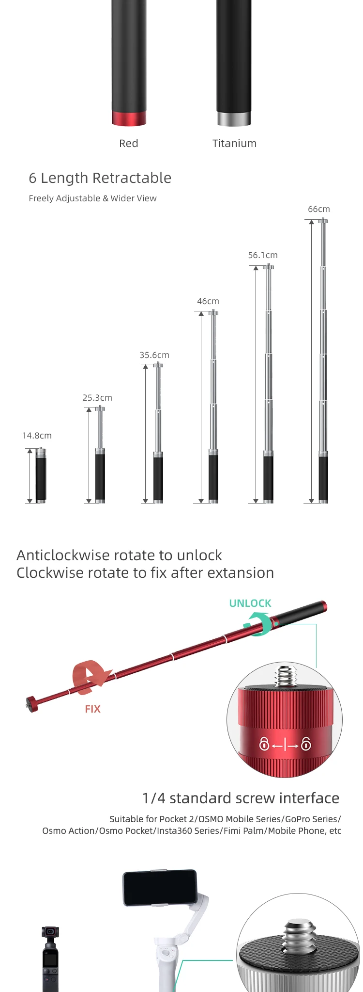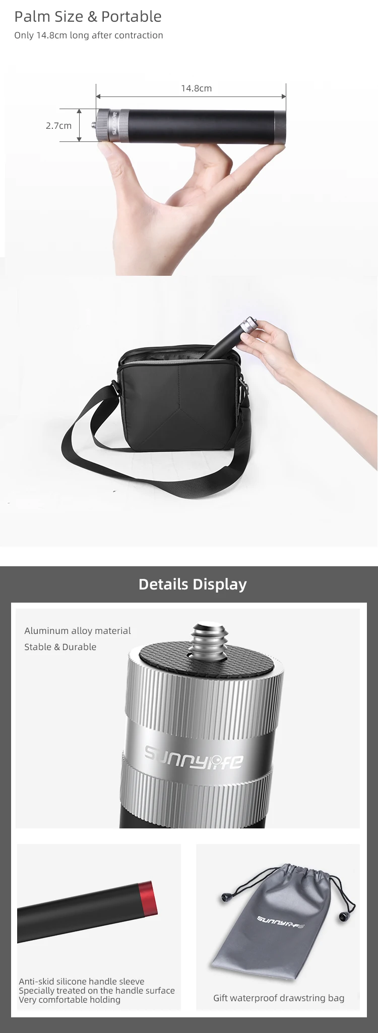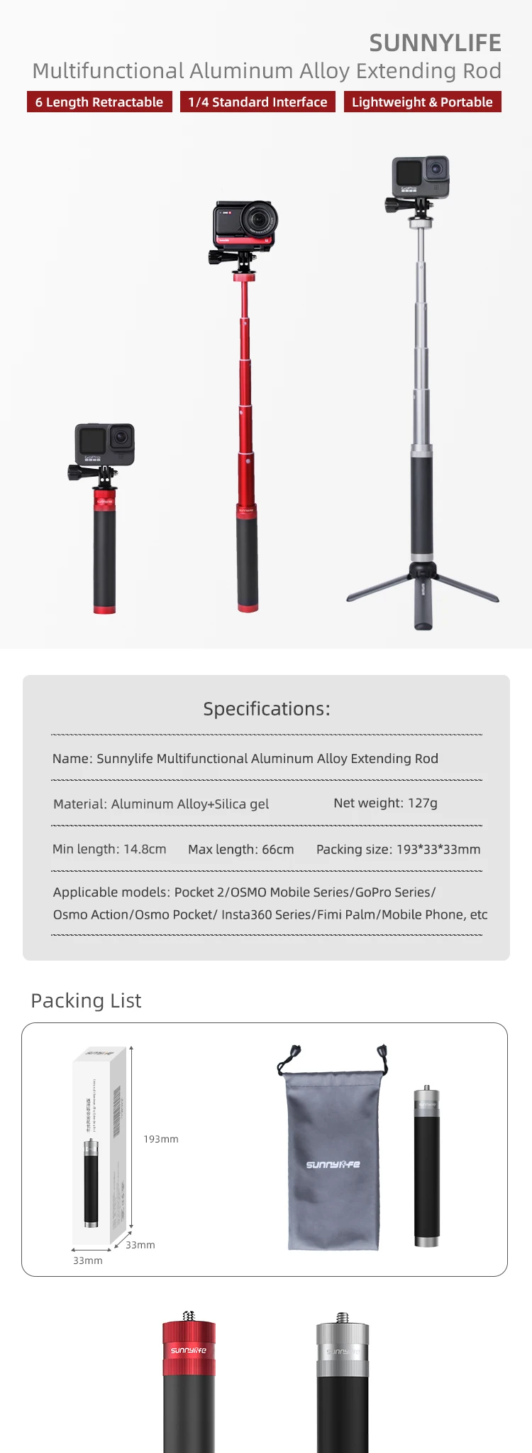 Sunnylife Aluminum Alloy Extension Rod Handheld Retractable Selfie Stick for ACTION 2/OM 5/POCKET 2/GoPro 10/Insta360 One X2
