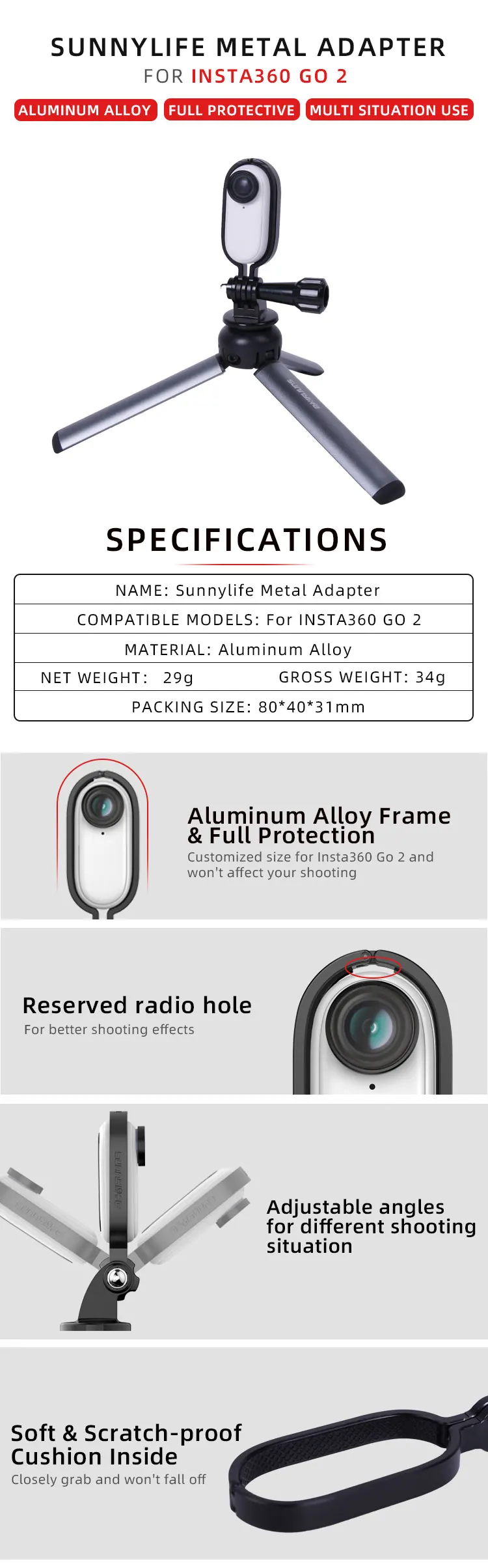 Sunnylife CNC Metal Protective Frame 1/4in Adapter Mount Bracket Accessories for Insta360 GO 2