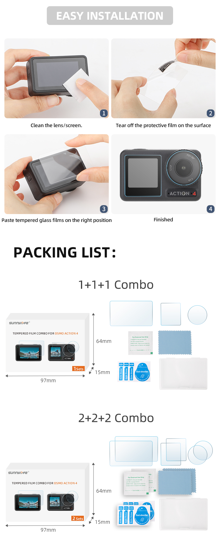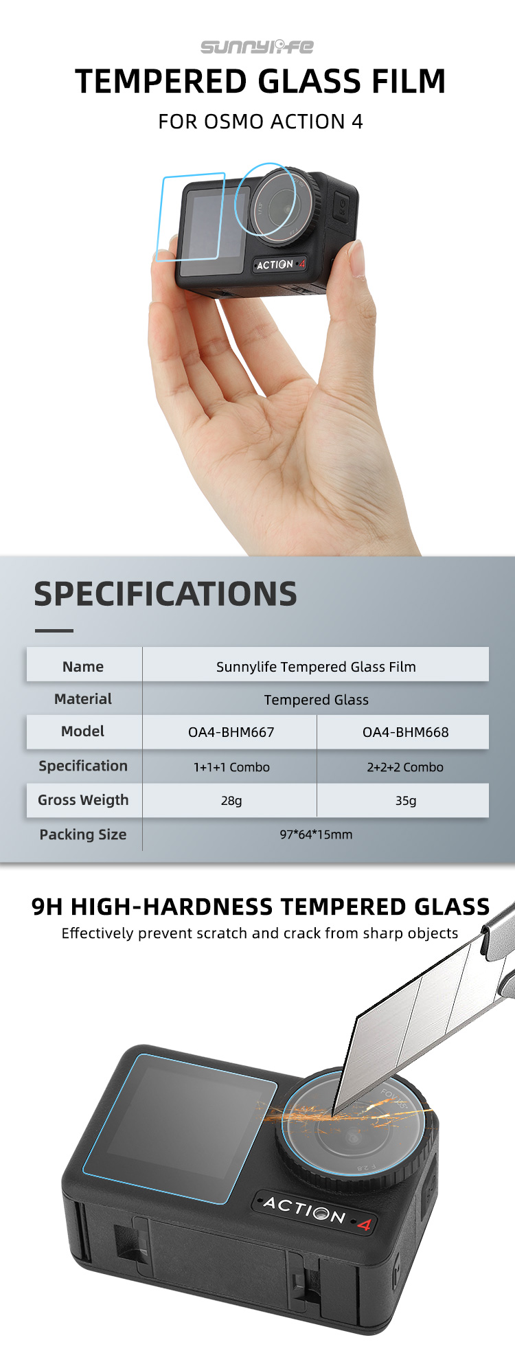 Sunnylife Lens Screen Protector Tempered Glass Film Protective Film Accessories for Osmo Action 4 Sport Camera
